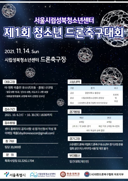 지난 11월 14일(일요일) 서울시립성북청소년센터 제1회 청소년 드론축구대회가 성황리에 개최됐다. (사)대한드론축구협회 마포지부, 서울특별시, 시립성북청소년센터, 광운대학교 공동으로 주관했다.