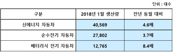 중국자동차공업협회(中国汽车工业协会)에 따르면 2018년 1월 신에너지 자동차 생산량은 4만569대로 전년 동월 대비 약 4.6배 증가했다.