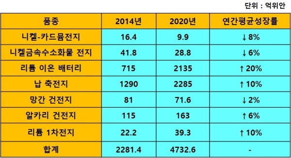 연간 평균 성장률은 10~20%로 납 축전지 성장률은 10~20%, 리튬이온전지 성장률은 20~30%가 각각 예상된다. 전지 수출액은 연간 평균 10~15% 성장이 예상되며 이중 약 55%가 리튬이온 전지가 될 것으로 전망된다.